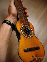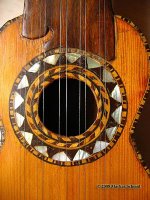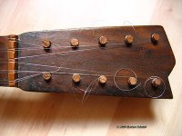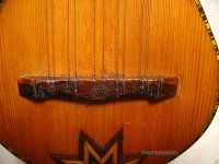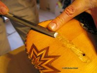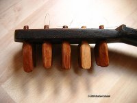 Nachdem ich auch die Leimreste auf der Brückenunterseite entfernt hatte (und auch die Planheit dieser Klebefläche geprüft hatte) musste ich die Saiten-Kanäle mit einer Nadelfeile neu öffnen, bzw ebenfalls von den Leimresten befreien. (Diese Brücke hat nicht wie eine Gitarre Löcher für die Saiten, sondern Rillen, die gegen die Resonanzdecke hin offen sind, henau wie man es bei Lauten und Barockgitarren kannte.)