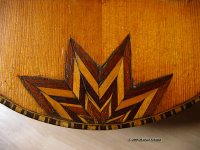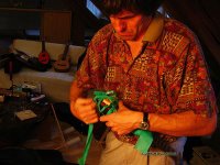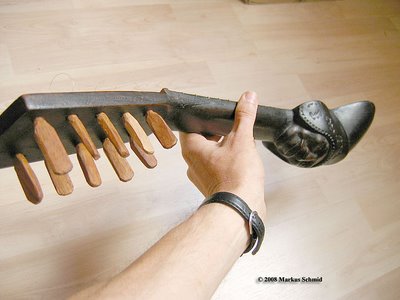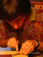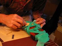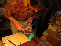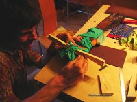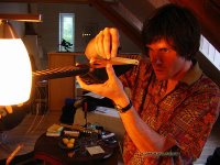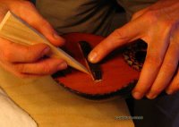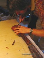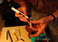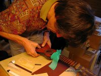 Nun trage ich Leim auf der Brückenunterseite auf und gebe dabei acht, dass kein Leim in die Rillen gerät. Das Holz muss gut mit Leim bedeckt sein, jedoch nicht soviel, dass der herausgedrückte Leim die Rillen füllen könnte. Ein zu grosser Leimüberschuss würde zudem die Positionierung der Brücke erschweren, sie würde "davonschwimmen" wollen. Zuwenig Leim würde eine "ausgehungerte" Verleimung ergeben, die nicht stark genug ist. Um ein "davonschwimmen" zu verhindern, hilft es den Druck auf die Brücke langsam zu erhöhen, um dem Leim Zeit zu geben herausgepresst zu werden.
