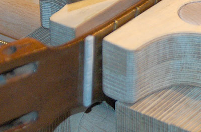 Para el nuevo diapasón he eligido madera meranti que tiene una textura y un color parecido a estos del cedro, pero es un poco más dura y más resistente. El charango original no tenía trastes en la zona del diapasón que se encuentra sobre la tapa armónica. Como en todo caso ya tenía que "modernizar" el charango con la conversión a cuerdas de nailon me pareció lo más normal de también extender los trastes sobre el diapasón completo, como se lo hace en todos los charangos "modernos" con cuerdas de nailon. Además he agrandado el tiro de cuerdas por unos 5 mm, con el fin de tapar con el nuevo diapasón un "arreglo" chapuzero anterior de la cejuela. Con este cambio de tiro, ahora el traste n° 13 cabe casi en la unión mástil-caja, lo que varios luthiers de charango en Bolivia usan como estándar.