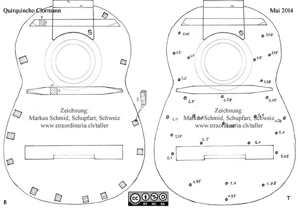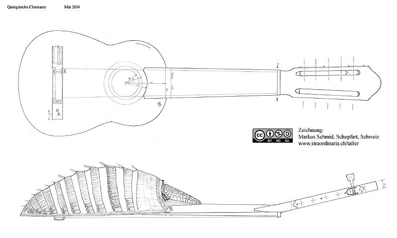 El plano se refiere al charango reparado y modificado. Trataré de ampliarlo por un juego de hojas adicionales para el charango en su estado original que estaba hecho para encordar con cuerdas metálicas.