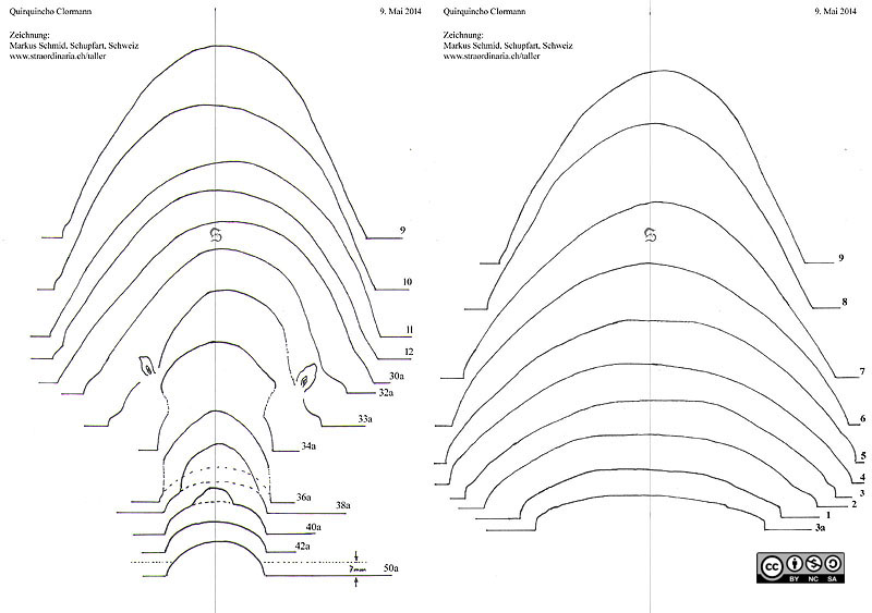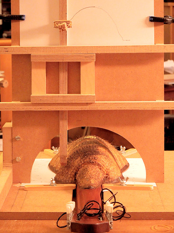 Todo el plano está hecho lo más fiel posible según la geometría exacta del instrumento, es decir con todas las imperfecciones, irregularidades y asimetrías. He trazado las secciones en las hojas n° 4 y n°5 con esta herramienta desarrollada y construida por mi mismo: