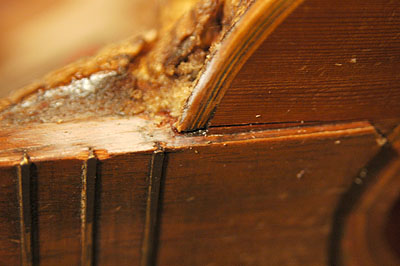 He reparado las dos rajaduras en la tapa, la del lado de bordones estaba apretada y solamente era necesario pegarla con cola animal caliente, mientras en el lado de tiples la grieta estaba tan abierta que era necesario llenarla con una astilla. Además he reforzado la grieta desde el interior de la caja con una madera delgada de pinabete (Picea abies).